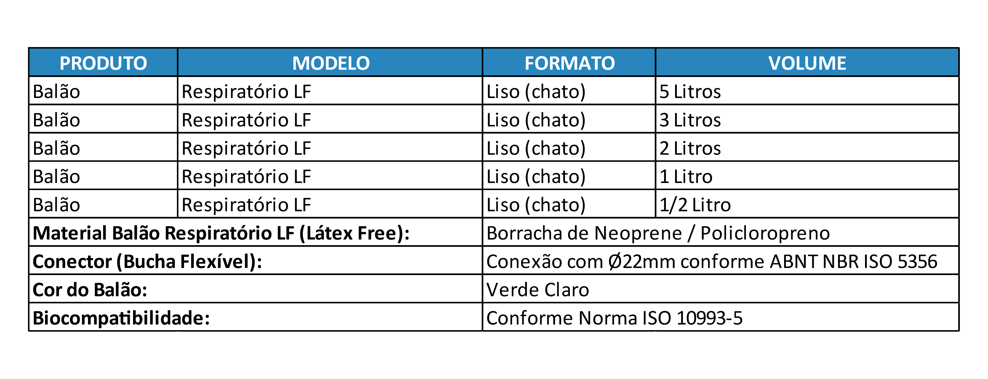 O Balão Respiratório LF (Látex Free) é um produto para saúde indicado para promover anestesia inalatória, sem reinalação, para uso em procedimentos médico-hospitalares. O Balão Respiratório LF (Látex Free) é utilizado em procedimentos médico-hospitalares e pode ser utilizada em ambulâncias, terapia intensiva, recuperação, e outras necessidades.