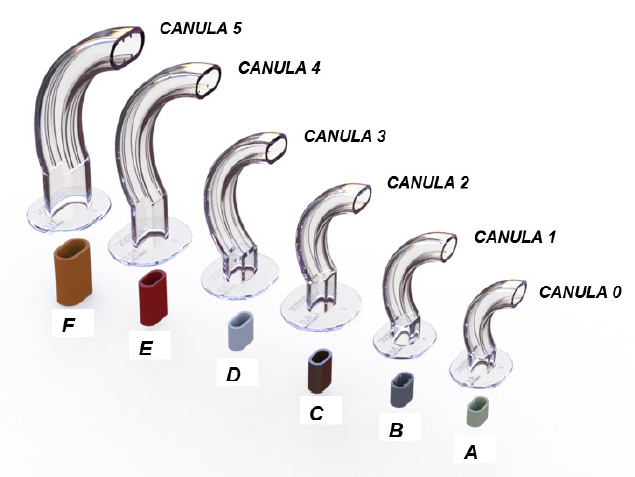 As Cânulas possuem insertos definidos por cores/tamanho designado que facilitam a identificação.