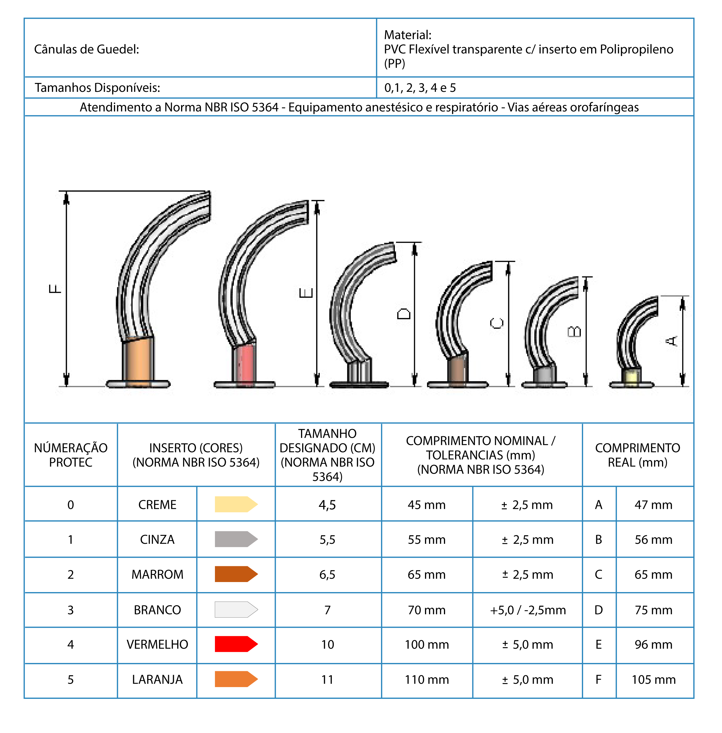 A Cânula de Guedel Protec é um produto constituído de PVC flexível transparente, em forma de tubo achatado, ligeiramente curvado e com inserto de polipropileno. A transparência do tubo, permite a visualização da cor do inserto facilitando a identificação do tamanho da Cânula.