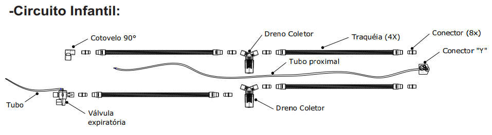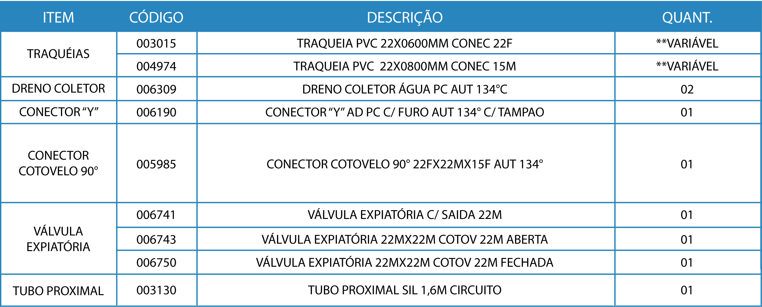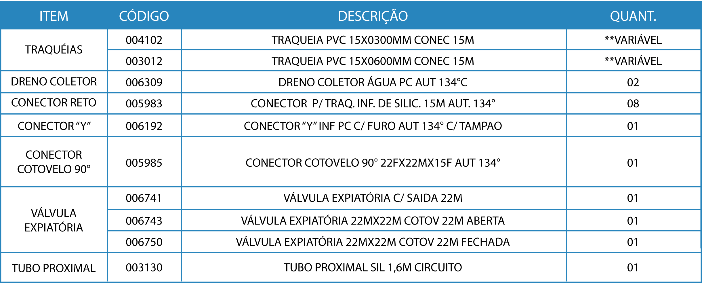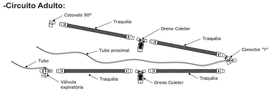 Os circuitos paciente são fabricados com materiais atóxicos recomendados para fabricação de produtos de uso hospitalar. São compostos por conectores intermediários, traqueias em PVC com parede interna lisa e com estrutura externa em elipse, o que evita a oclusão da passagem dos gases, além de dreno coletor de condensação; tubo proximal e válvula expiratória, utilizados nos circuitos. Opcionalmente, pode-se utilizar com a jarra de umidificação (Registro ANVISA 80435140006).