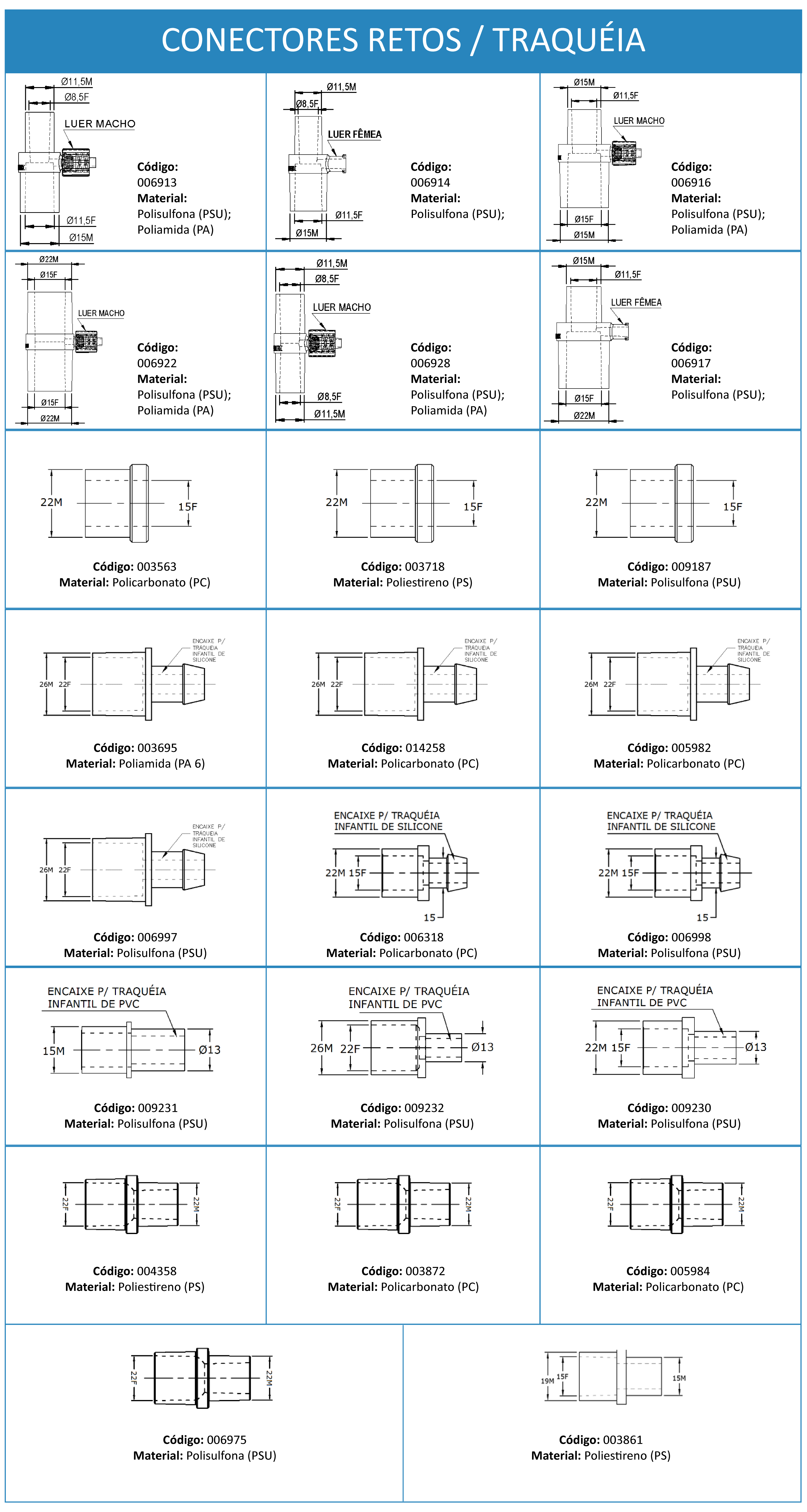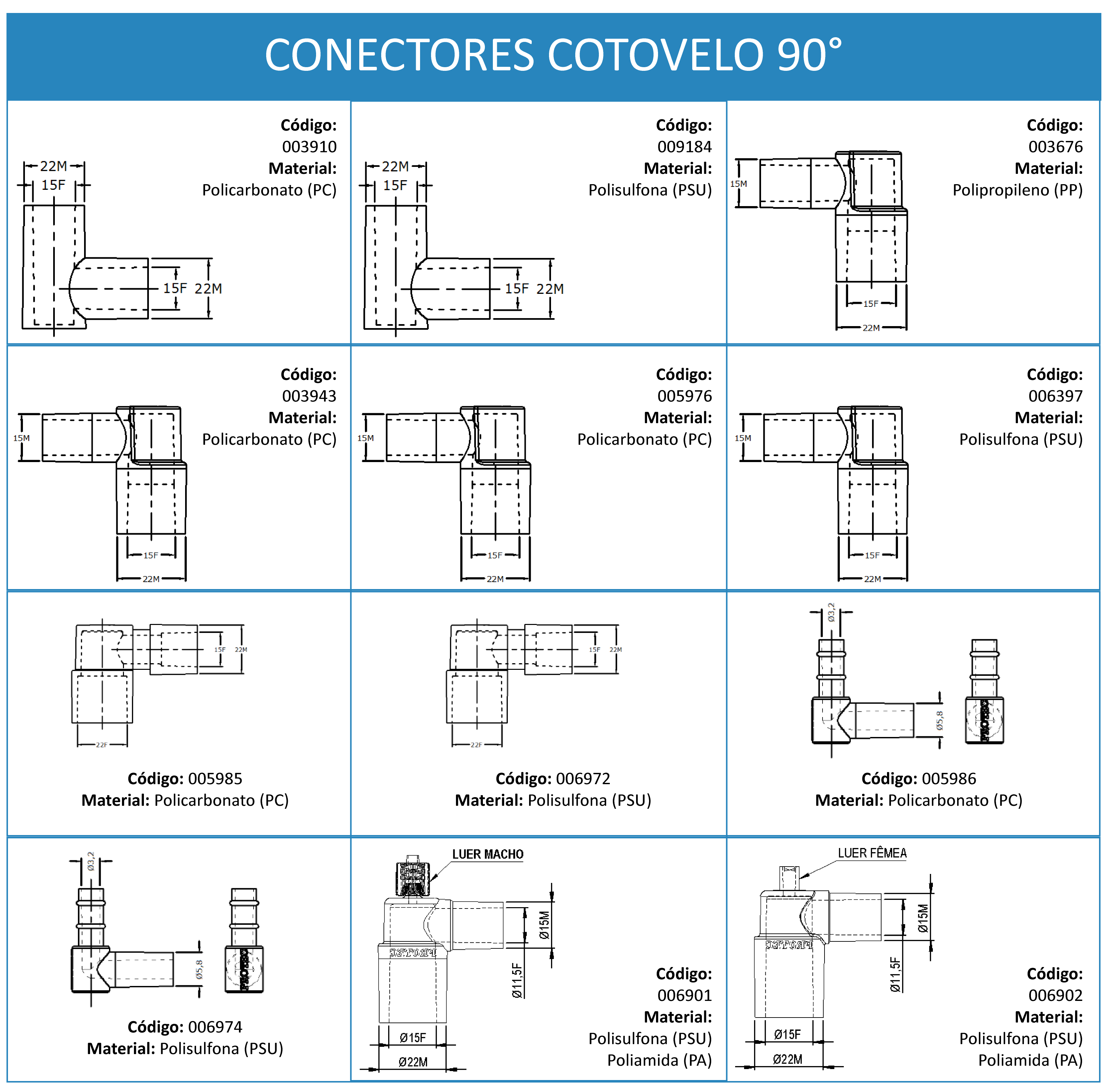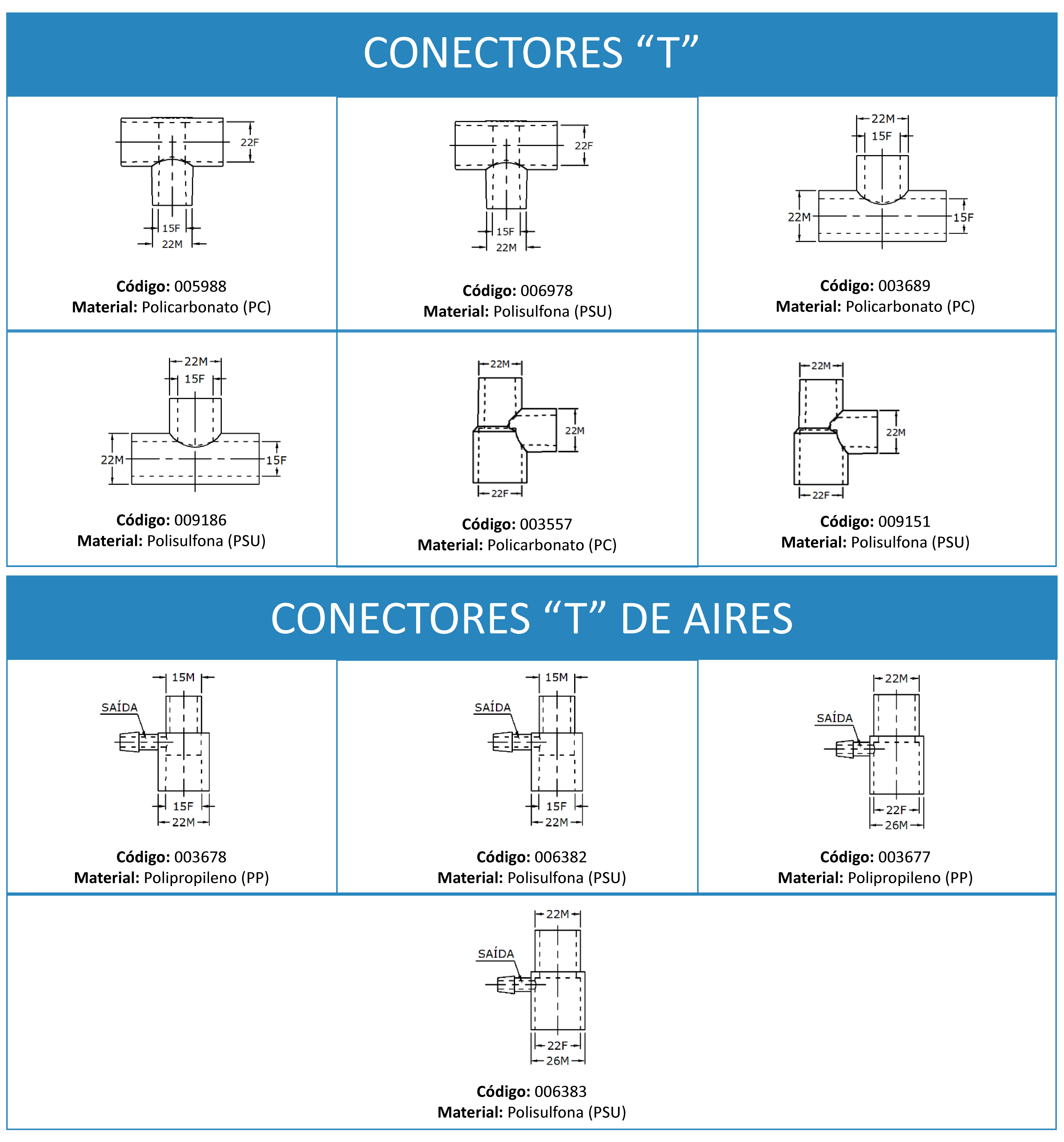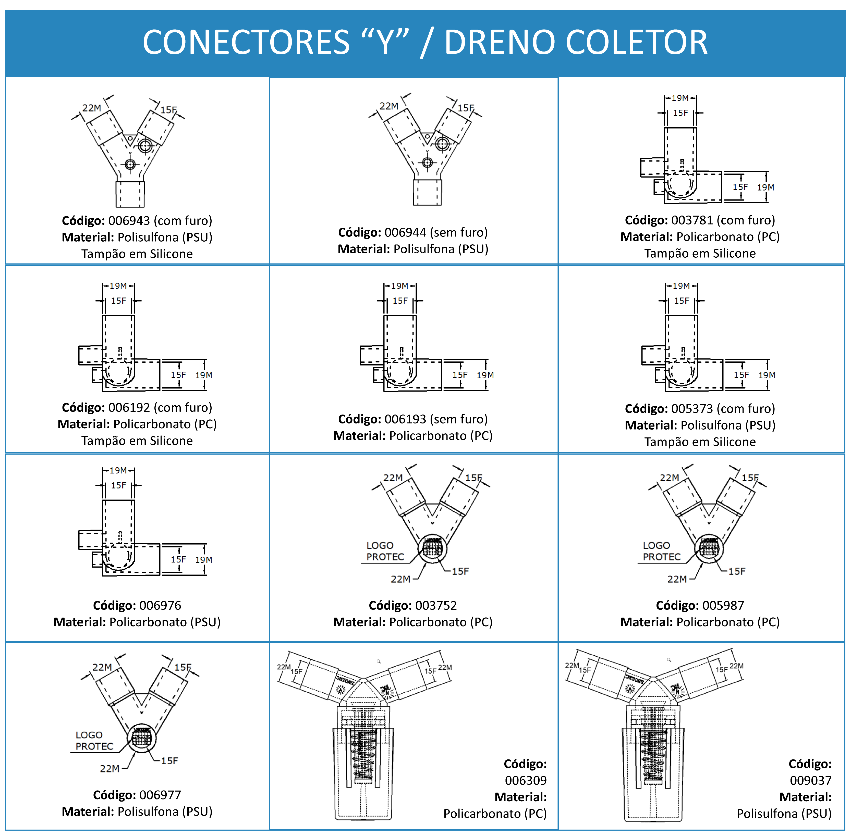 Os Conectores Intermediários Protec são dispositivos construídos em Nylon (PA), Polipropileno (PP), Policarbonato (PC) e Polisulfona (PSU), disponíveis em vários modelos, a fim de se adequar a diversos procedimentos médico-hospitalares.