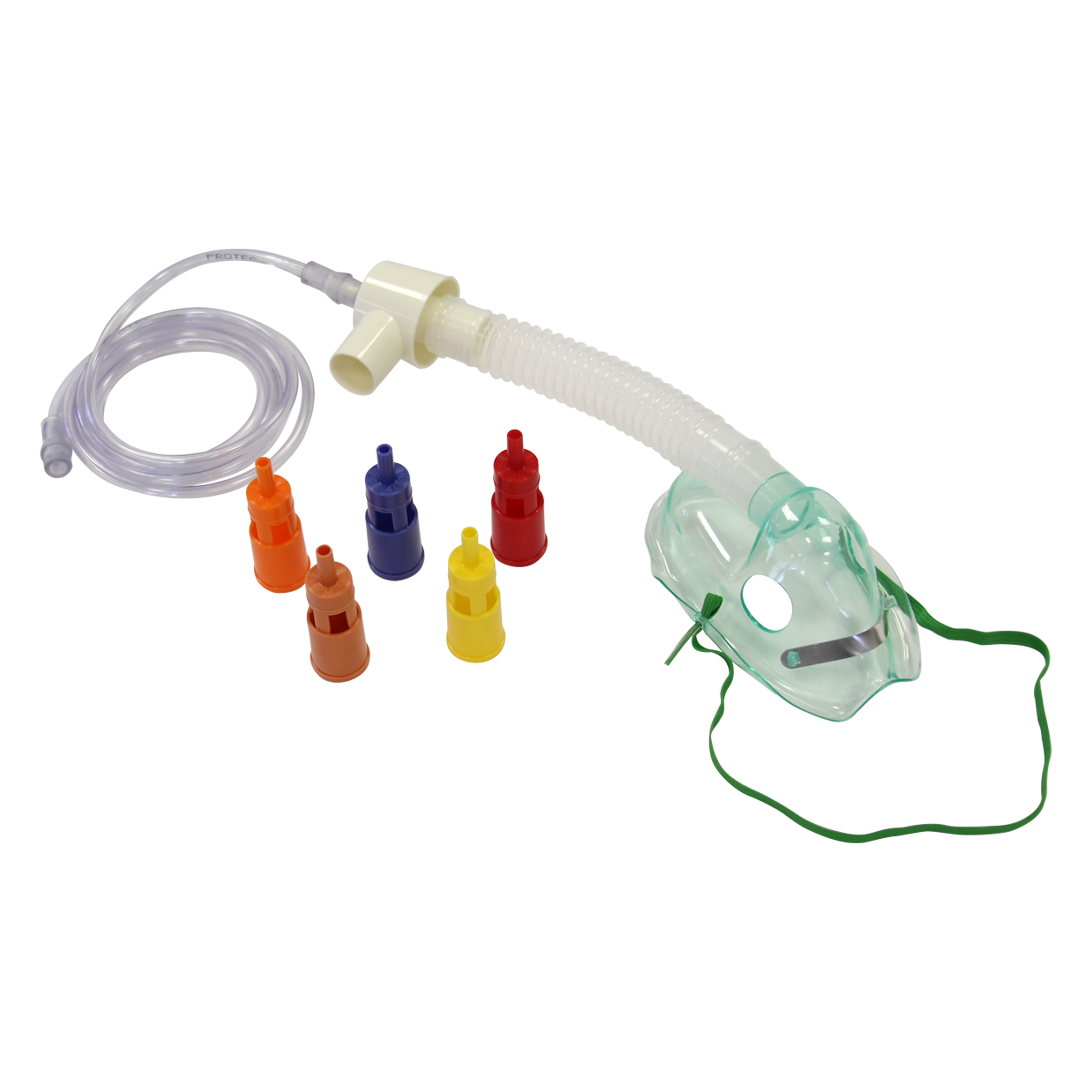 A Máscara Venturi é baseada na passagem de um alto fluxo de oxigênio, verticalmente, pela parte inferior de um diluidor. A velocidade do oxigênio cria uma pressão negativa nos orifícios laterais do diluidor aspirando o ar ambiente.