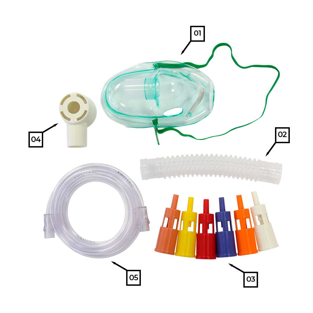 A Máscara Venturi consiste de cinco componentes principais, os quais estão representados na vista explodida, abaixo.