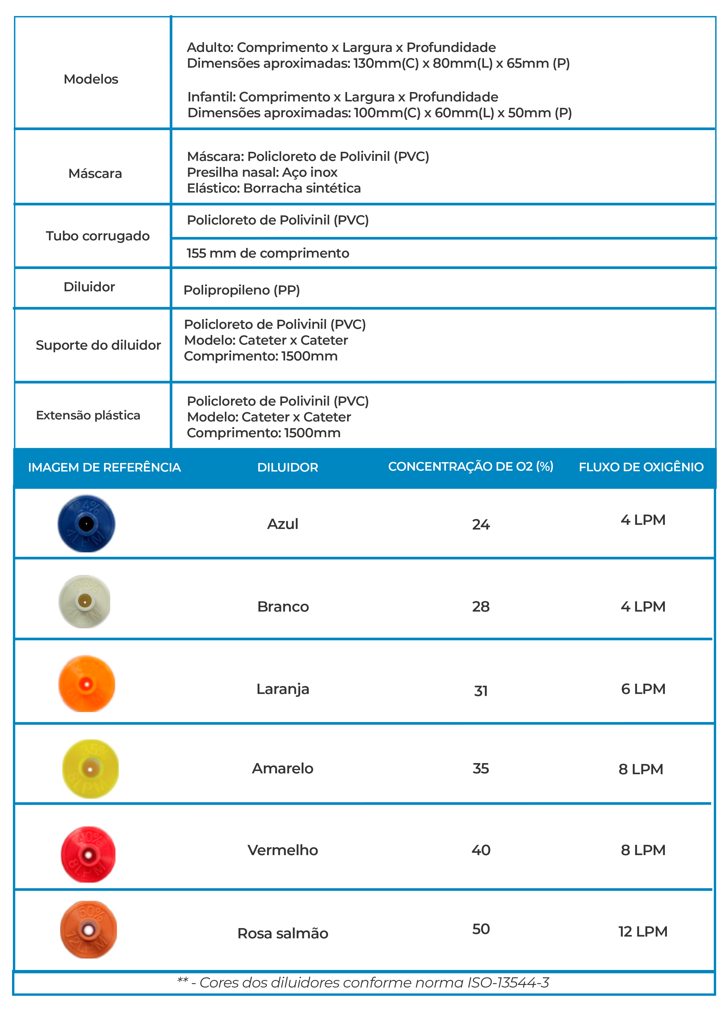 • A Máscara Venturi Protec é alimentada por uma fonte gás na sua extremidade, e através de diluidor é estabelecida a concentração de oxigênio necessário para atendimento do paciente, onde a cor / descrição no diluidor determina o percentual de oxigênio.