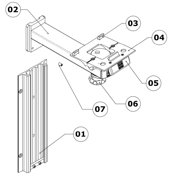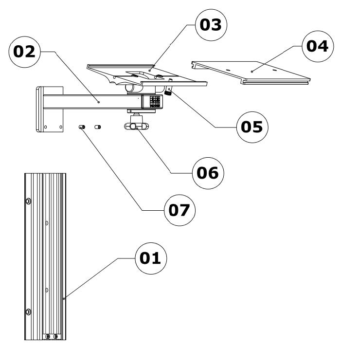 O Suporte para Monitores RD10/MDRY Protec, consiste sete partes principais, os quais estão representados na Vista explodida abaixo.