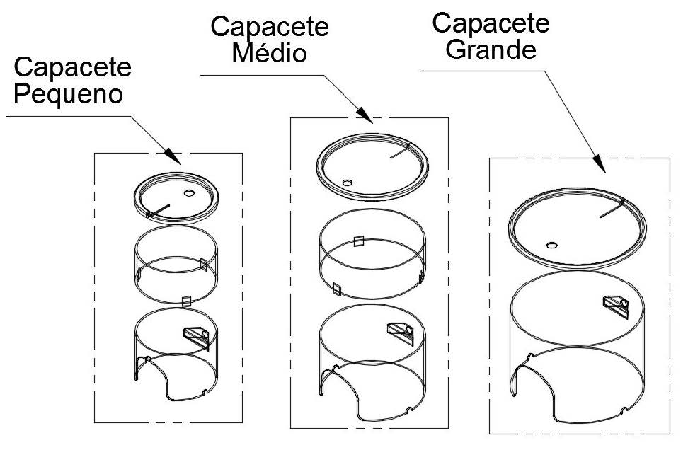 Capacete Médio: 20 cm (diâmetro) x 21 cm (altura) Capacete Pequeno: 15 cm (diâmetro) x 17 cm (altura)