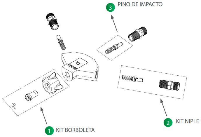 O Macronebulizador consiste de três componentes principais, os quais estão representados na Vista explodida abaixo.