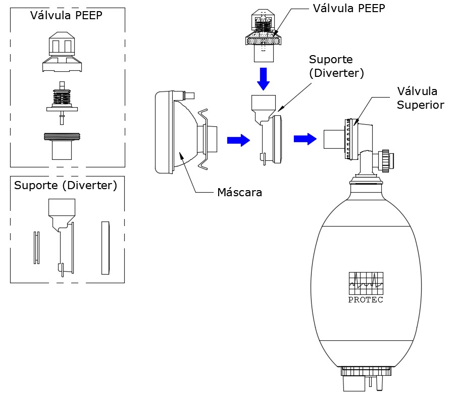 2. Conecte o suporte para válvula PEEP (Diverter) à saída do paciente (válvula superior do reanimador) conforme mostrado no desenho explodido;